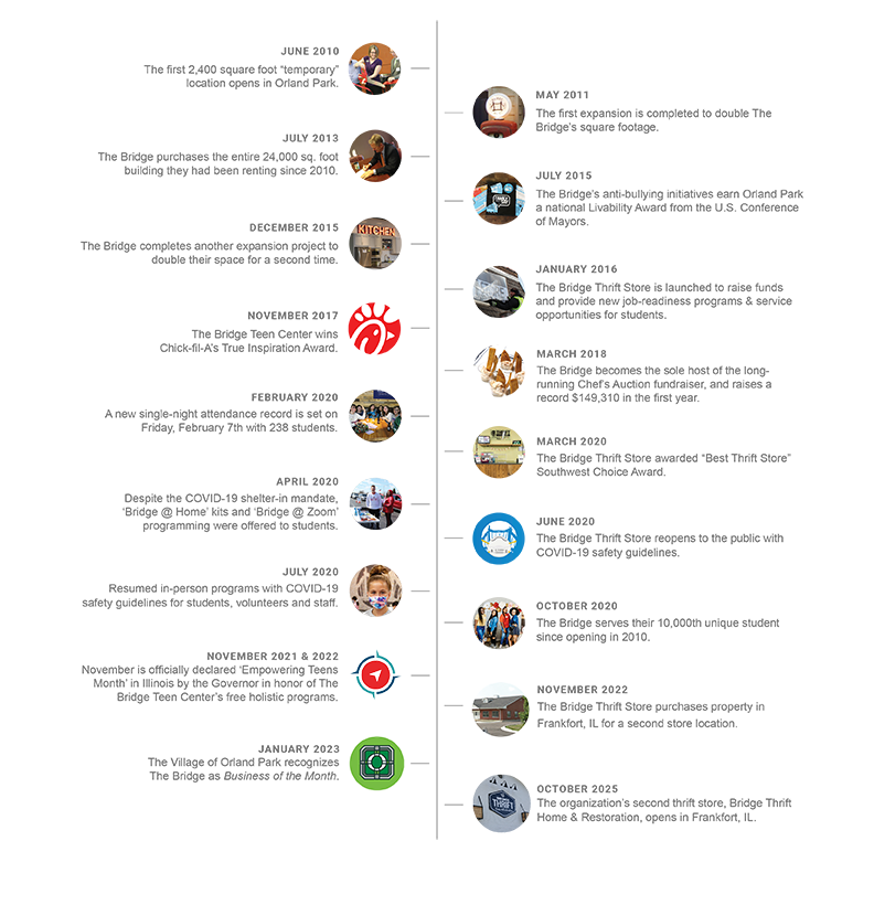 The Bridge Teen Center is an innovative grassroots nonprofit community center that was designed around the interests and needs of teens in the suburbs. We opened in Orland Park in 2010, and have served over 14,000 different teens and families from 128 Chicago Southland and Northwest Indiana communities.